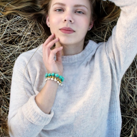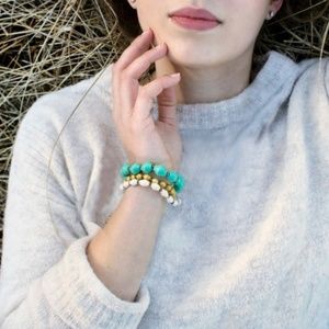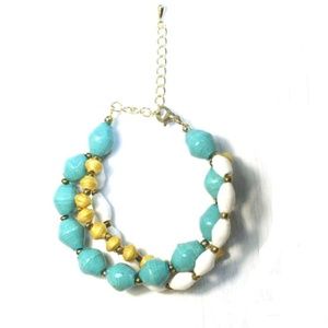 The Rose bracelet is made with delicate yet glitzy gold paper beads paired with bold yet neutral white and turquoise. Made on three strands with brass separator beads purchased locally in Kampala. Fastens with a lobster clasp and sizing chain, ensuring a perfect fit for most. Tuli's paper beads are handmade from salvaged and recycled paper, which is cut into thin strips and rolled into beads. Next, each bead is hand-painted and coated with a water-based varnish. Made in Uganda. Gift box included