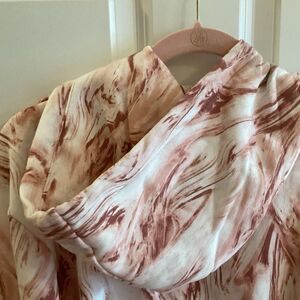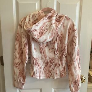 New with tags. Jenni Brand Style & Size Line/Macy’s hoodie slip on sweatshirt with a twist. - asymmetrical rounded hemline and 6 fitted darts for styling. Long sleeved and working hoodie tie. All in a twist of wine and rose splash print against a white background. Warm and cozy cotton/poly blend. Showing photos of front and back sides along with fiber contents and care tags. Available in sizes XS with overall length of. 21“ . Size 1X with length of 23” overall and 2X with 23 1/2” length.