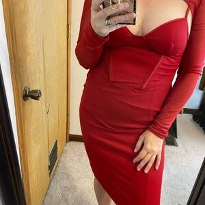 NWT red long sleeve mesh cutout corset top midi dress. Knockout style. Gorgeous, sexy, and flattering. Great for night out, event, day night, etc. size L. Fits true to size. (Q)