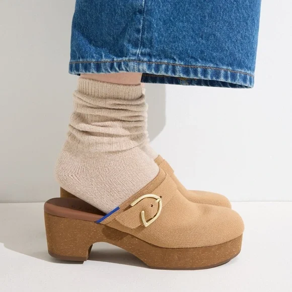 Soft, roomy upper in camel brown knit with Rothy’s signature thread.