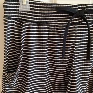 New with tags. Roudelain, a brand carried at Macy’s women’s size small black and white striped pj shorts. Soft and comfy, they feature a fully elasticized waist with working drawstring tie. In solid black. Showing front and back sides along with fiber content and care tags. Washable polyester and spandex blend is super soft and they have two side split working pockets.