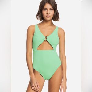 Roxy Color Jam One Piece Swimsuit. Crafted from a textured blend of recycled stretch fabric, the Color Jam solid one-piece swimsuit elevates a classic fixed-strap design with a front cut-out and an O-ring at the center.