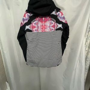 NWT Roxy black striped pattern dry flight hooded ski jacket. IN PERFECT CONDITION. Bought but never worn. All lined, 2 front zip pockets and 2 inside chest pockets, adjustable waist band with inner snap waist. Size Medium. Measurements are: armpit to armpit 20” and length back 30” and front 28”. Non Smoker