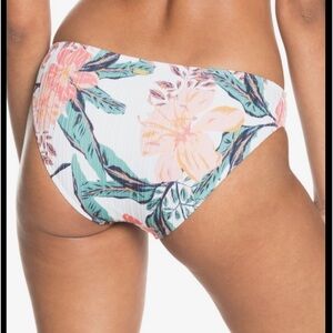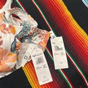 New with tags Roxy floral bikini. Full coverage bottoms and panty liner not removed. Bikini top is tie in front and offers a nice push up actually. M size fits size 6-8 waist and top is for about B to C cup ~34 bust.