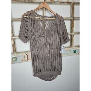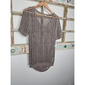 NWT Roxy Taupe Open Knit High Low Short Sleeve Top Size Large