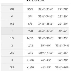 Chicos size 1, comparable to a small 4. See picture for more detail.