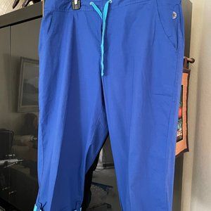 NWT Royal Blue Danskin Capri Pants-Large 12-14. 98% cotton and 2% spandex. 2 side slip in pockets, and 2 zippered back pockets for secure items. Waist measures 19" across, hips 22, rise 19-23". Roll up turquoise cuffs, secured by button closure. Drawstring at waist adds to perfect fit. Machine wash cold. Ships same day or next. Beautiful summer color!