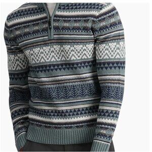 In pristine condition. Royal Robbins' "Ponderosa" 1/4 zip knitted sweater in colorful fair isle-esque patterns of navy, blue-green, white and a bit of brown. Ribbed collar. Royal Robbins calls this color "light slate."