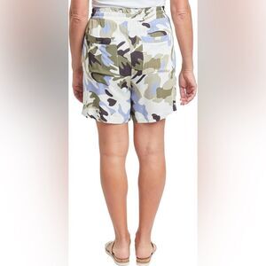 Stylish camouflage print shorts. Features a mix of green, blue, and cream colors. Perfect for casual wear.