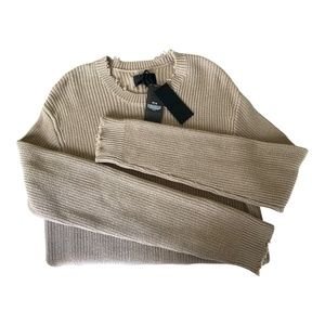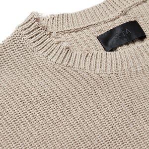 RtA men's distressed cotton crew neck long sleeve sweater. New and never worn with original tags. Sweater has distressing details at the neck , cuffs, and hem. There is a vertical alternating knit detail from neck to hem on the back of the sweater. Size small. Color "tan". Manufacturer's Care tag explicitly notes " hand with care , due to the nature of fabric yarn pilling could happen over time. This garment is delicate and requires extra care in handling and cleaning. Each garment is handcrafted and uniquely designed which creates a look that may differ within each piece. not one piece is alike."