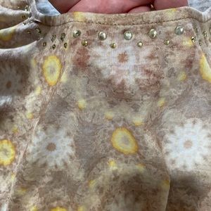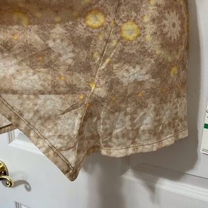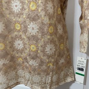 Brand new top by Ruby Rd, women’s size Large. This would be a perfect fall transition piece as it’s still light weight, but has 3/4 sleeves. Tans, browns, yellows and whites in the top, has a cute slightly bejeweled neckline and a shark bite hem on each side. Semi sheer…last pic shows how much it can be seen through. Retails for $49.