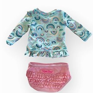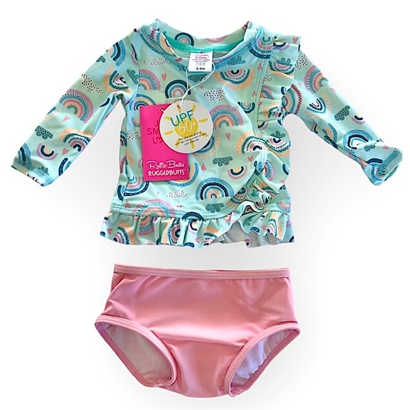 NWT! Absolutely adorable 50+ UPF rash guard bikini for your lil one. Bottoms have the cutest ruffles on the back ๐. Hearts, rainbows, clouds, long sleeve bathing suit, ruggedbutts. ๐ โ