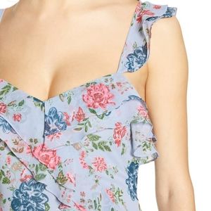 Ruffle trim adds dynamic movement to this romantic floral-print dress.