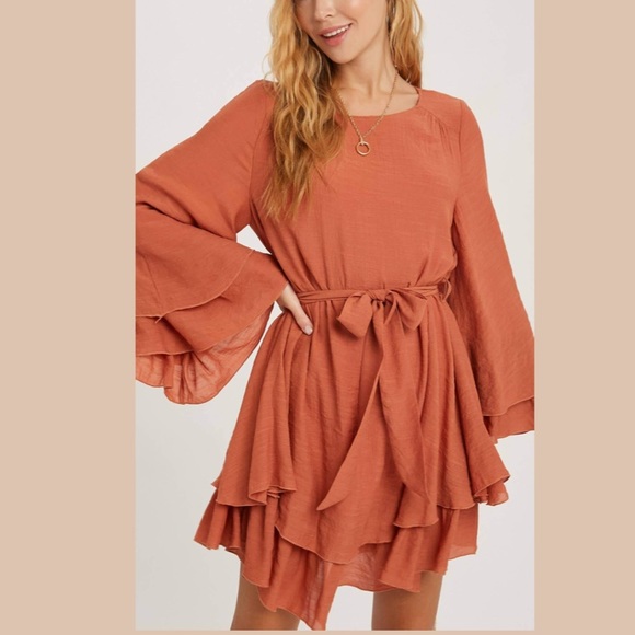 Boho style woven dress featuring a double layered wide bell sleeve and a matching ruffle hem to the skirt, self tie belt, round neck, relaxed fit and flare