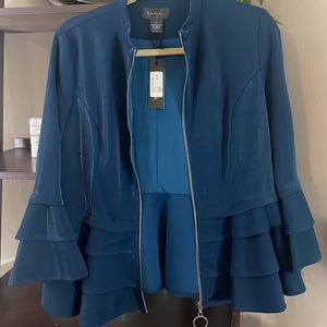 NWT Garcia front zipper peplum blouse with silver detail. Teal shimmer Color, Crew neck, 3/4 length teal bell ruffle sleeve.