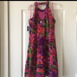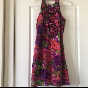 Adorable Madison Leigh Dress. Buttons around the neckline in back forming a keyhole look. Ruffles at top and subtle layers at the bottom. Lined. Great for any occassion.