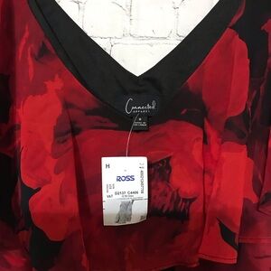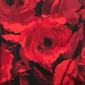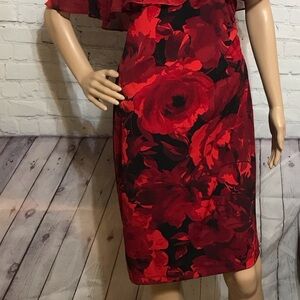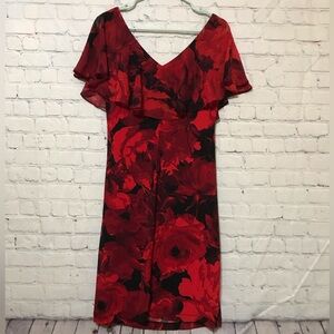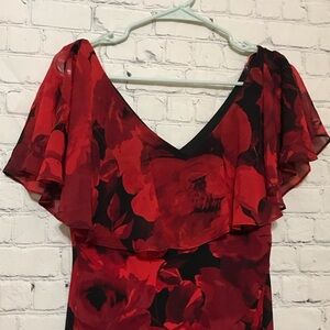 This stunning dress features a vibrant red and black floral print with a V-neck and flutter sleeves.