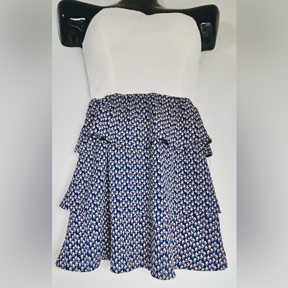 This adorable blue and white flowered strapless dress is super cute and fresh feeling! Its classic design and comfortable fit make it a must-have in your wardrobe. The dainty floral pattern on the ruffles is super pretty!