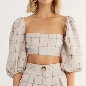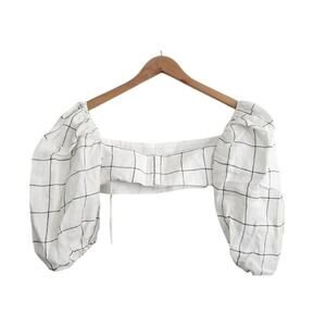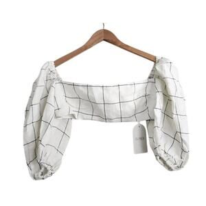 Revolves Rumer The Label Quinn Plaid 3/4 Puff Sleeves Linen Crop Top Back clasp closure M Ivory White Black