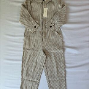 Stylish cream striped jumpsuit with matching beanie. Perfect for a chic look.