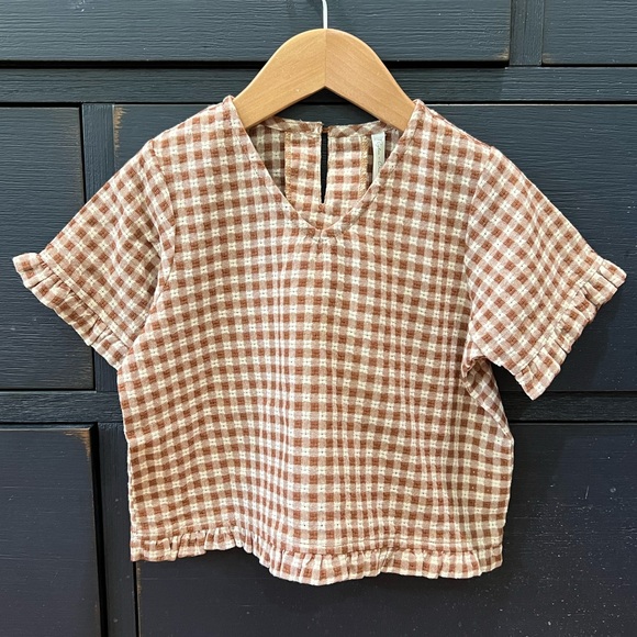 Incredibly cute gingham top with ruffled hem and sleeves. Size 4-5y.