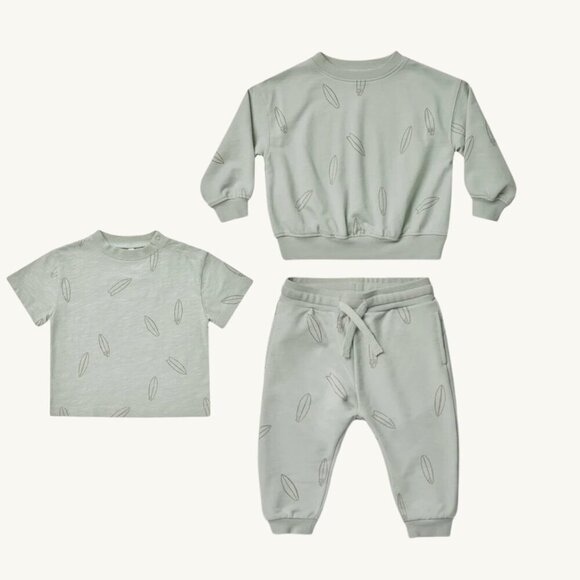 A soft, lightweight, and comfy fleece set from Rylee + Cru, featuring a subtle tonal surfboard print. This bundle includes: