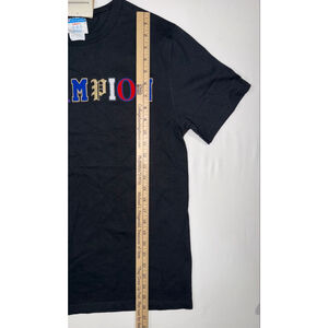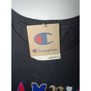 New-with-tags Champion Heritage Tee featuring a bold multicolor embroidered logo on a classic black heavyweight cotton base. Timeless, clean streetwear staple with a structured fit.
