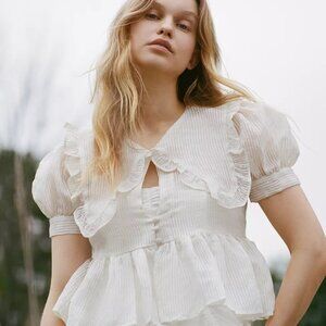 Femme blouse from Kimchi Blue in a textured fabric with a pinstripe effect. Cropped to the waist with puffy sleeves and a flared peplum silhouette. Topped with an oversized collar featuring ruffle trim. Find it exclusively at Urban Outfitters.