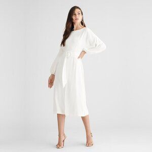 Annie is the quintessential dress for every occasion. This chic ivory sheath boasts clean lines complemented by an elegant, understated bracelet sleeve ruched at the cuff, creating subtle volume. Complete with a center front slit and self-sash, its lightweight crepe fabric drapes elegantly and is perfect for three seasons.