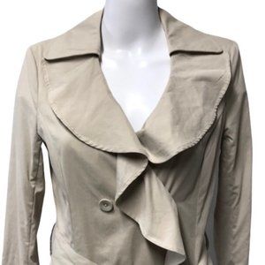 Khaki Saks Fifth Avenue trench coat with ruffle trim, belt at waist, pockets at hips and button closures at center front.