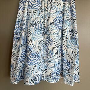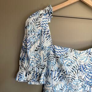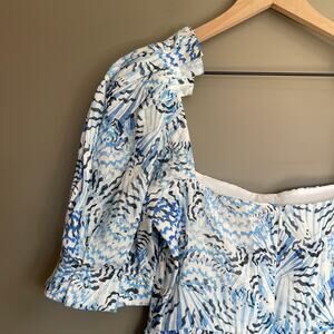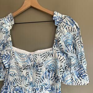 New with tags Saloni Rachel abstract-print Mini Dress, SALONI Rachel-D Mini Dress in Neptune Azure, Size 2, Blue White Shell Nautical Print, Linen, Short Sleeves, Puff Sleeves, Sweetheart Neckline, A-Line Silhouette, Lined