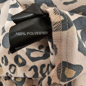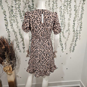 This is a Sanctuary brand dress in a leopard print. It is size S and is made of 100% polyester. The dress is new with tags and is in a box. The dress is a wrap style with a V-neck and short sleeves. It has a ruffle hem and is a mini length. The dress is pink with black and brown leopard spots. The dress measures 17 inches across the bust.