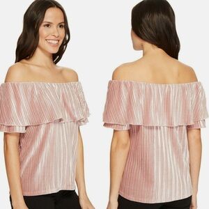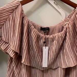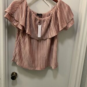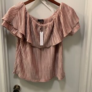 Size small Stylish velvet pleated texture blouse. Off the shoulder. Pullover. Short sleeves. Flounce layered neck. Hits at hip.