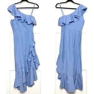 This sky blue asymmetrical summer dress is a beautiful one-shouldered dress from Sandro Paris. It captures a sense of flamenco flair in a fresh and elevated way. Its airy ruffles infuse the silhouette with movement that was made for the dance floor!