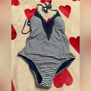 Stylish halter swimsuit with blue and white stripes. Features a lace detail on the front.