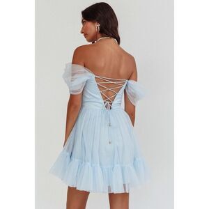 NWT SELFIE LESLIE PIXI OFF-SHOULDER LACE-UP BACK BACK DRESS Baby Blue S