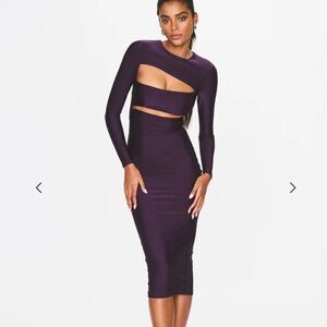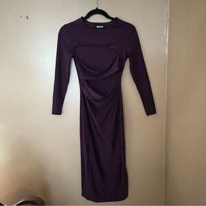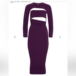 Long-sleeve midi dress with cutouts throughout the bodice. Bodycon fit. Shown here in Eggplant.