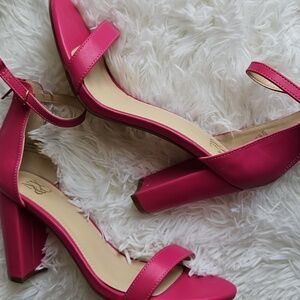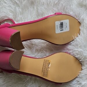 These New York & Company heels feature a chic ankle strap design in vibrant pink and neutral tan, perfect for adding a touch of elegance to any outfit. With a moderate heel height and minimalist style, they offer both comfort and sophistication. The smooth finish and clean lines make them a versatile choice for various occasions.