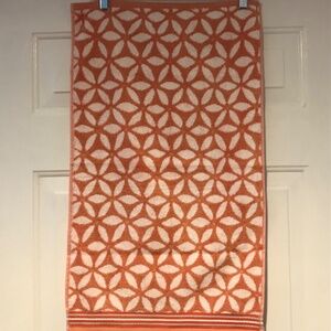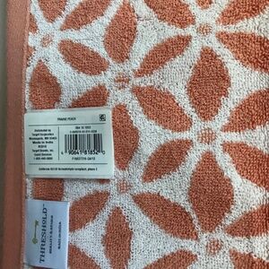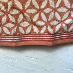 Set of 2 bathroom hand towels white abstract floral print with a peach background. Bottom decorative hem featuring white and blue/green beaded top stitching.