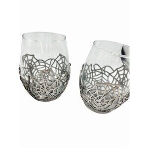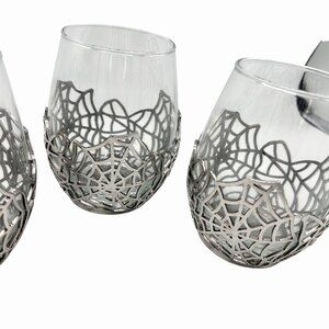 NWT SET OF 3 LARGE SILVER METAL SPIDERWEB STEMLESS WINE WATER GLASSES HALLOWEEN