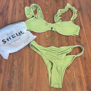 NWT SHEIN Green bikini with ruffle top padded Brazilian bottom size S