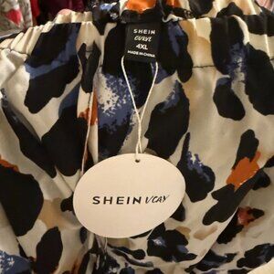 The SHEIN skirt in size 4XL is a stylish and comfortable addition to any plus-size woman's wardrobe. Made by the brand Shein, this knee-length skirt features an animal print pattern in a fun multicolor design. The skirt has an elastic waist for a perfect fit and is lightweight, making it a great choice for any casual occasion. The tulip style and mid-rise cut add a trendy touch to this wardrobe staple.