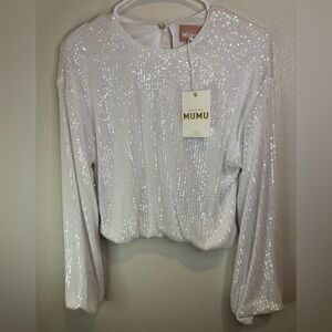 NWT Revolve SHOW ME YOUR MUMU Good Times Top in White Sequins Size S. New with tags. Let the good times roll in this party top of the season! A stretchy neutral glitz fabric escalates this classic silhouette. Style with your fave denim and booties.