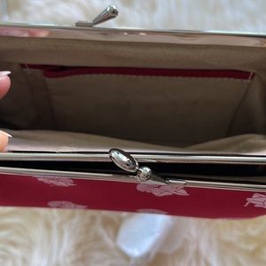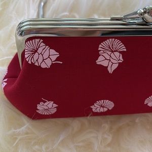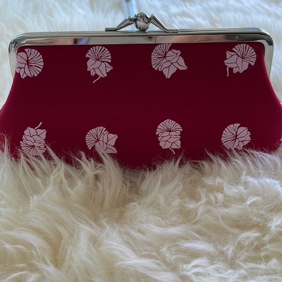Beautiful and brand new, Japanese styled clutch purse bag with kiss clasp closure from Sig Zane Designs Hawaii! Made in Japan. Red with pink floral design. Sold out! Two separate compartments, one with a card sized slip pocket. Perfect to carry your keys, phone, and other small items when you’re out and about! Measures approximately 8.5” length (at its longest), 2” depth, and 4” high (excluding clasp). Measurements were taken by me and are approximate. Smoke and pet free home.