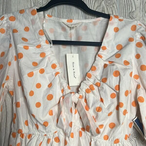 NWT SIM & SAM V-Neck Puff Sleeve Mini Dress Polka Dot White Orange Size Medium