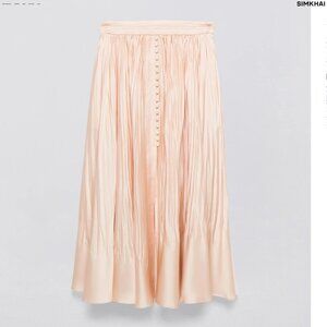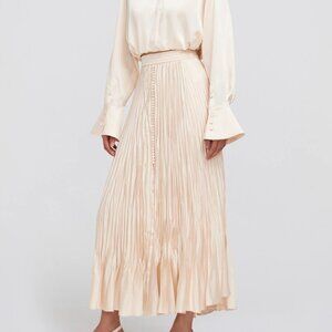 The Dulce Skirt in Blush. Satin skirt adorned with sartorial button accents and tonal waist band, falling into a flowing, midi-length hemline. Crafted using multi-dimensional fine pleating for an eye catching texture display.