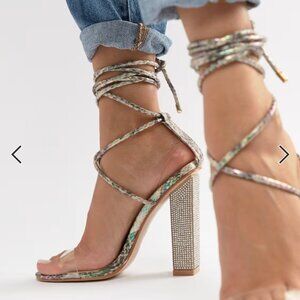Make a dazzling, trendy statement! These brand new Simmi London heels are the ultimate summer or party shoe, featuring a vibrant floral snake print and eye-catching rhinestone block heels. The laces wrap dramatically up the leg for a fashionable look.