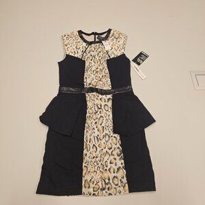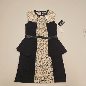 Make a statement in this stunning Express sheath dress featuring a fierce leopard print, sleek black colorblock panels, and edgy faux leather trim detail. Flattering peplum-style hips add a chic touch. Fully lined, back zipper closure, brand new with original $79.90 tag. Size 6. Perfect for date night, parties, or adding a bold twist to your workwear wardrobe!