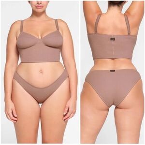Experience the perfect blend of comfort and style with this SKIMS brown bra. Crafted from a soft, matte fabric, it features structured cups and adjustable straps for a personalized fit. Its minimalist design makes it an essential piece for layering or wearing on its own.