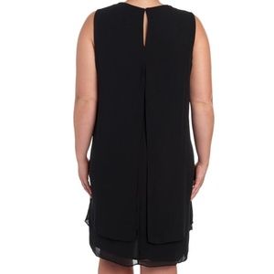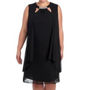 A cluster of faux pearls accent the neckline of this gorgeous layered sheer chiffon shift dress from SL Fashions New York. Cutouts at the neckline add an alluring detail.